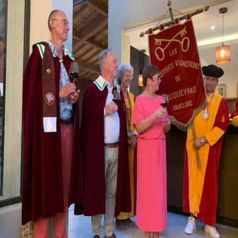 Diner & degustatie met een verbroederingsceremonie van de Confrerie des Maitres Vignerons de Vacquyeyras met Commanderij Osiris-Gent van de Vlaamse Wijngilde in Chateau du Bois d’Arlène.
