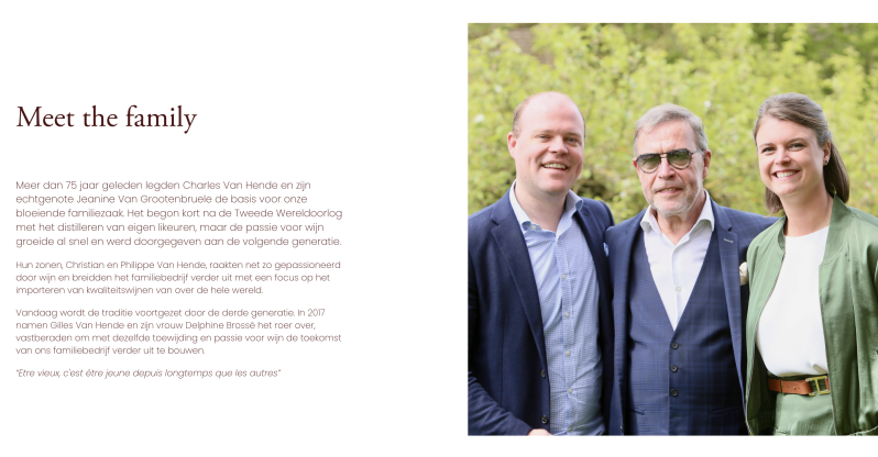 De passie voor wijn werd doorgegeven aan de volgende generatie. Hun twee zonen Christian & Philippe Van Hende kregen dezelfde wijnmicrobe te pakken en zetten de traditie verder met de visie op het importeren van kwalitatieve wijnen van over de hele wereld. Na hen is het nu aan de derde generatie om met diezelfde ambitie en passie voor het product alle mooie toekomstplannen van deze familiezaak met traditie verder uit te bouwen.
